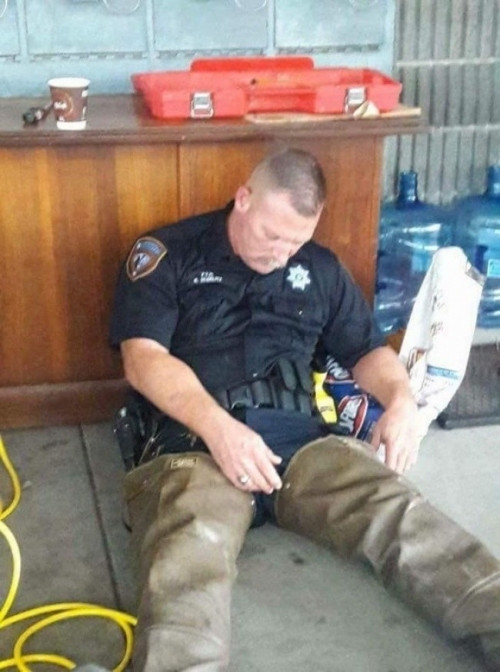 Nhân viên cảnh sát Mỹ nghỉ ngơi sau nhiều giờ giúp vô số người dân gặp nạn do ảnh hưởng của bão Harvey.