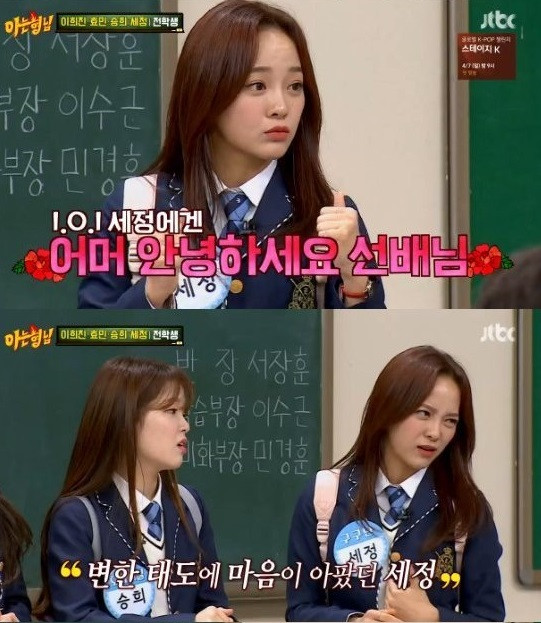 Nghe thấy vậy, Kim Sejeong bèn chia sẻ trải nghiệm không vui của mình “Người ta vẫn bảo rằng bạn chỉ là tiền bối nếu bạn nổi tiếng. Khi còn là thành viên của I.O.I, lúc nào cũng có các hậu bối tươi cười chào hỏi nói chuyện với em. Các hậu bối nhìn thấy em đều bảo “Ôi trời ơi, em chào tiền bối”. Nhưng bây giờ khi gia nhập nhóm Gugudan, thì em bị họ ngó lơ luôn”.