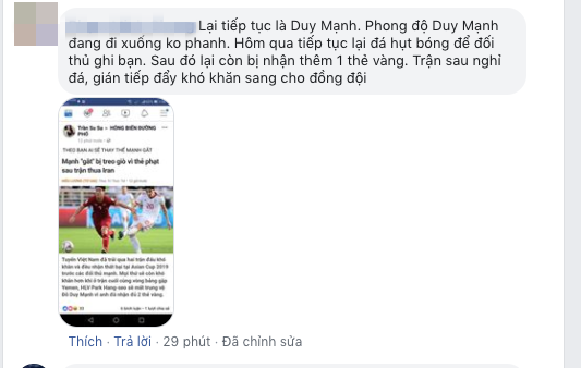 Sau trận gặp Iraq, Duy Mạnh, Đức Chinh và Văn Lâm nhận về “cơn mưa” chỉ trích cùng những lời cay đắng thì lần này, Duy Mạnh lại tiếp tục nhận những lời không hay từ chính cổ động viên đội nhà.