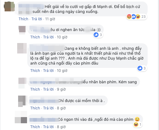 Duy Mạnh đã rất dũng cảm cảm phá bóng của một cầu thủ đội bạn, tuy nhiên sau đó anh đã phải nhận về thẻ vàng. Ngay sau đó, trang facebook cá nhân của anh nhận về vô vàn chỉ trích và những lời so sánh. Thậm chí, bức ảnh do cô bạn gái Quỳnh Anh đăng tải, gắn thẻ tên bạn trai cũng trở thành mục tiêu công kích của những người hâm mộ quá khích.