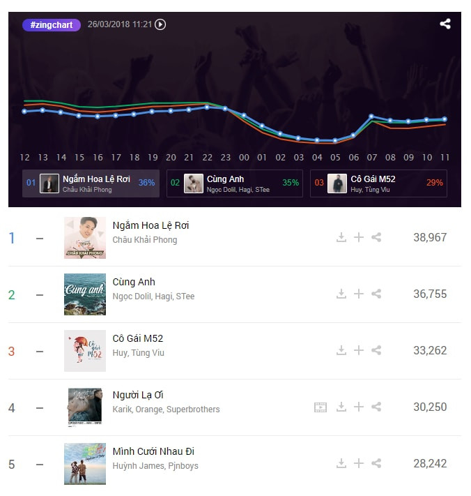 Mặc dù Quan Trọng Là Thần Thái và Ngắm Hoa Lệ Rơi đã nhiều lần vượt lên thứ hạng cao trên BXH realtime nhưng trong BXH tuần thì Cùng Anh, Người Lạ Ơi và Mình Cưới Nhau Đi vẫn "chễm chệ" đứng vững ở TOP 3 đầu bảng.