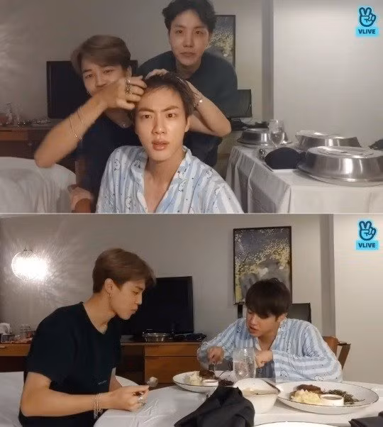 Đang trò chuyện, Jimin bỗng thú nhận “Mình không thích ở nhà một mình nên đã gọi thêm anh Jin đến rồi. Mình còn chuẩn bị sẵn đồ ăn đây này”. Vậy là hai chàng Jin, Jimin vừa ăn uống ngon lành vừa giao lưu với các fan, như một show mukbang chính hiệu vậy.