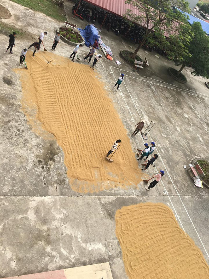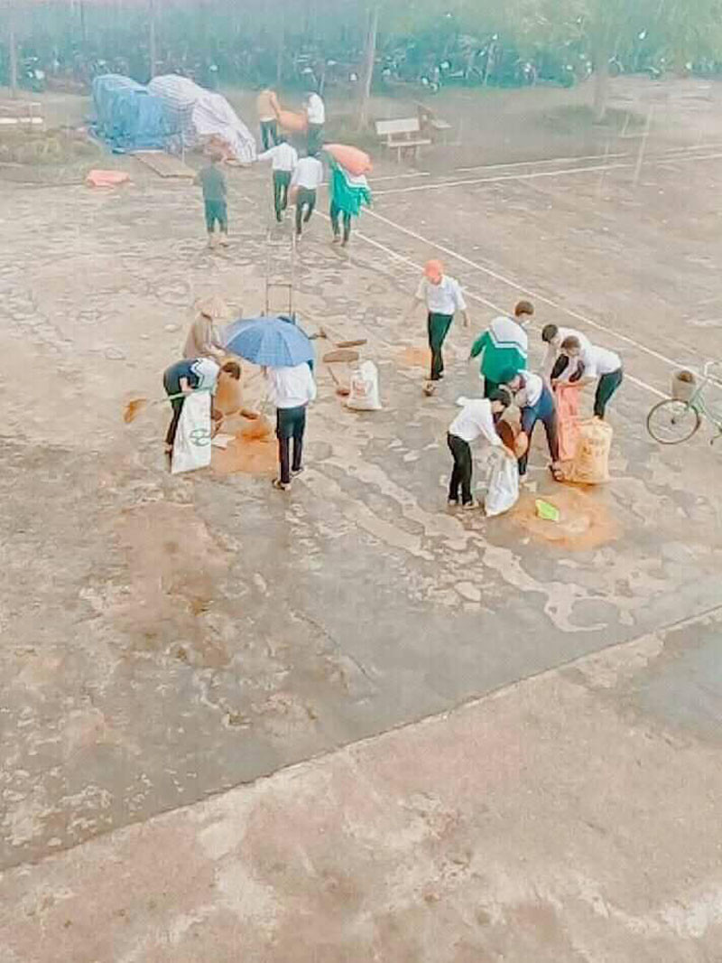 Vì thóc được phơi ở cả khoảng sân rộng mà trời lại chuẩn bị đổ mưa nên nhóm học sinh tại ngôi trường này đã nhanh chóng chạy ra giúp bác bảo vệ dọn thóc vào bao.