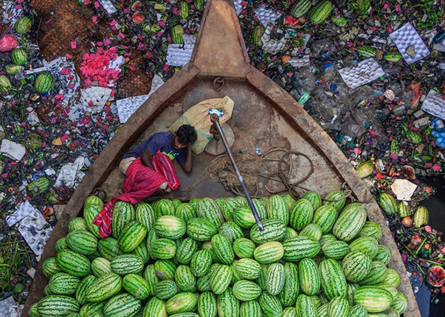 “Cuộc sống trôi nổi trên dòng sông ô nhiễm” của Tapan Karmaker. Trong ảnh, một người bán dưa hấu nằm trên thuyền của mình trong khi con thuyền trôi dạt trên dòng sông Burigongga bị ô nhiễm nặng nề ở Dhaka, Bangladesh.