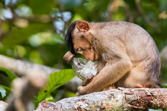 “Not in My Forest”, tạm dịch “Không phải trong khu rừng của tôi”, nhiếp ảnh gia Calvin Ke. Một chú khỉ đuôi lợn phía Nam ôm chặt một chai nhựa trong môi trường sống tự nhiên nguyên sơ của nó ở Borneo, Malaysia.