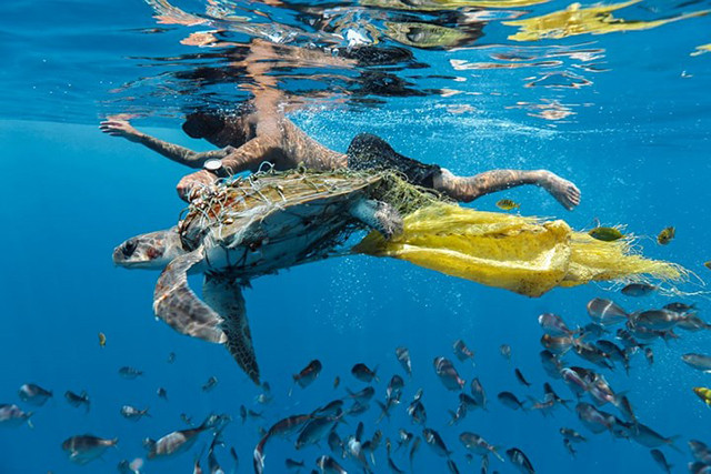 Bức ảnh “Cứu Rùa” của nhiếp ảnh gia Jing Li. Trong bức ảnh, một người đàn ông đang cố gắng giải cứu một con rùa bị mắc kẹt do ô nhiễm.