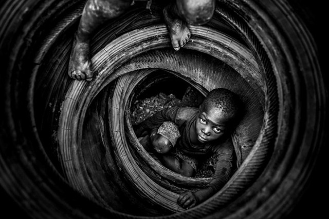 “Boulmigou: Thiên đường của những trái tim bị lãng quên” (Boulmigou: The Paradise of Forgotten Hearts) của Antonio Aragón Renuncio. Trong bức ảnh, trẻ em chơi với lốp xe cũ. Những chiếc lốp xe này có thể sẽ bị đốt cháy, làm nóng đá bên dưới và khiến đá dễ vỡ hơn trong mỏ đá Boulmigou bị ô nhiễm ở Ouagadougou, Burkina Faso. Hậu quả rất khủng khiếp: hỏa hoạn, bệnh hô hấp, ô nhiễm nước ngầm và thậm chí gây tử vong.