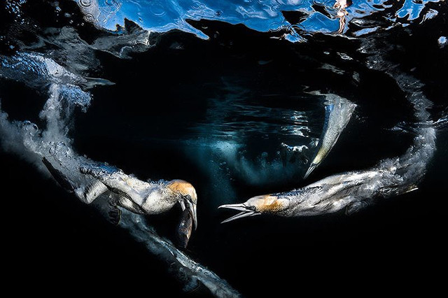Bức ảnh này chụp lại được khoảnh khắc săn mồi đặc biệt của chim ó. Thời điểm những con chim lao với vận tốc 100km/h từ độ cao 30m xuống mặt nước biển, để bắt cá thu và nhiều loại cá khác.