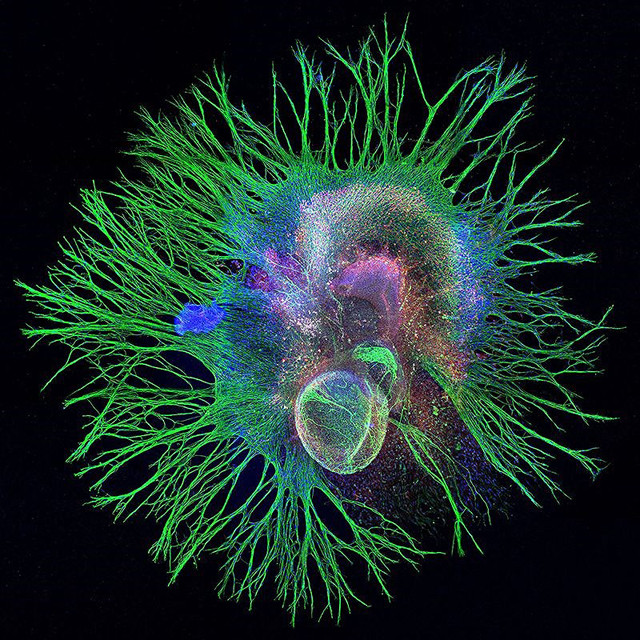 Hình ảnh tế bào thần kinh cảm thụ âm thanh bên trong tai của loài chuột. Các nhà sinh vật học tế bào Stephen Freeman và Laurence Delacroix đến từ Đại học Liège nước Bỉ, đã giành giải đặc biệt của cuộc thi ảnh Small World Photomicrography do Sony tổ chức cho bức ảnh này.