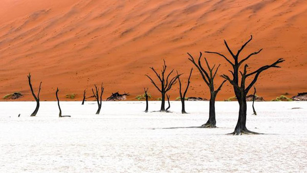 Deadvlei là một chảo đất sét trắng bao quanh bởi những cồn cát lớn nhất trên thế giới, một số cao tới 350 mét, thuộc Công viên Namib-Naukluft ở Namibia. Nằm rải rác trên bề mặt của chảo là rất nhiều cây gai lạc đà chết khô, một số được cho là 600 - 700 tuổi.