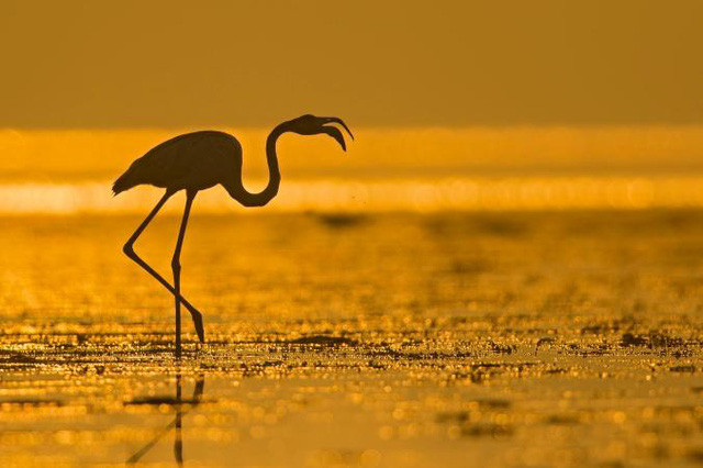 "Một chú hồng hạc cô đơn đang đứng tìm mồi khi Mặt Trời hiện ra phía đằng chân trời khiến nó như biến thành một màu vàng lấp lánh”- Sambath Subbaiah.