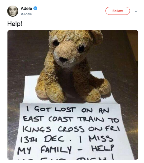 Nếu là fan của Adele ắt hẳn bạn sẽ không bao giờ quên câu chuyện: “Đăng tin tìm gấu lạc” của cô nàng. Nội dung trong thông báo “tìm gấu” khiến người hâm mộ cô nàng đồng loạt… bật ngửa: