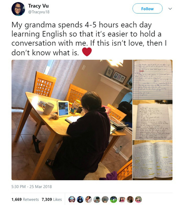 Đó là câu chuyện của cô bạn Tracy Vu, người đang sống tại Dallas, Texas, Mỹ. Cô đã kể câu chuyện về tình cảm gia đình thiêng liêng từ người bà Việt Nam của mình. Bà đã chăm chỉ học tiếng Anh 4 - 5 tiếng mỗi ngày để có thể giao tiếp với cháu gái. Tracy Vu đã đăng tải những tấm ảnh về bà đang cặm cụi học tiếng Anh cùng quyển vở ghi chép của bà lên Twitter. Cư dân mạng lập tức bày tỏ sự cảm động với câu chuyện dễ thương này.