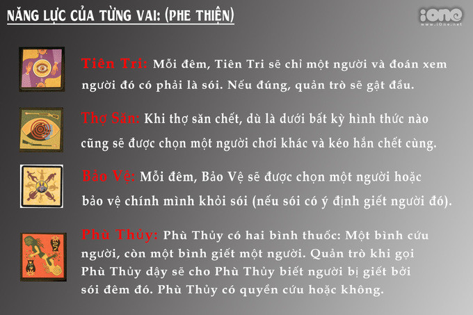 Một số điều cần biết về luật chơi. Bảng năng lực của từng vai trong phe thiện. Bảng năng lực của từng vai trong phe sói (phe ác). Rất nhiều "sói chúa" coi câu "Giết tao đi, bọn mày sẽ phải hối hận" làm câu cửa miệng mỗi khi đứng trước "cơ hội" bị... treo cổ. Dù cổ điển nhưng câu nói này luôn có thể cứu thoát chúng trong gang tấc. Câu kinh điển thứ hai mà cộng đồng sói vẫn luôn sử dụng là: "Tao không phải là sói!". Dạng câu nói này có thể dính vào bất cứ vai nào nhưng cách nói của "lũ sói" và cách chúng đánh lạc hướng sẽ là những dấu hiệu bạn cần lưu tâm. Dù đúng hay sai, tiên tri vẫn là vai mà sói muốn được nhập vai nhất. Trong cuộc chơi, bất kỳ ai nhận mình là "Nhà tiên tri" đều nhận được sự quan tâm từ mọi người, đôi khi chỉ một câu "Tao là nhà tiên tri" có thể cứu sống lũ sói ma mãnh. Đánh lạc hướng: đừng tưởng chiêu chứng minh mình trong sạch là độc nhất đối với lũ sói, đôi khi chúng chỉ cần "bẻ hướng lái" về một ai đó, mọi người sẽ bỏ qua nghi ngờ với chúng.