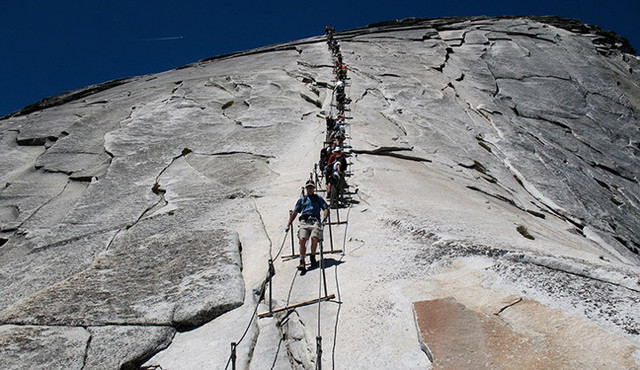 Cầu thang thẳng đứng ở Vườn quốc gia Yosemite ở California, Mỹ: Chỉ 300 người được tham quan địa điểm này mỗi ngày và du khách cũng phải đáp ứng được yêu cầu thể chất phù hợp bởi 400 bậc trên cầu thang dây thừng gần như thẳng đứng.