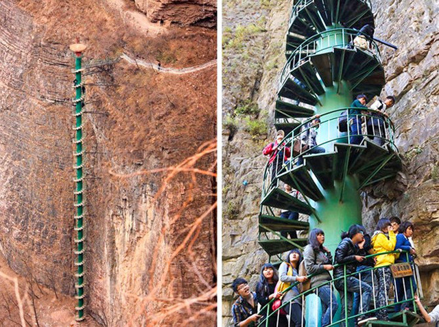 Cầu thang xoắn ốc cao hơn 90m ở Thái Hành Sơn (Trung Quốc): Những người trên 60 tuổi không được phép lên cầu thang xoắn ốc này vì đi lên khó khăn và tác động của những cơn gió khiến cho toàn bộ công trình rung lắc.