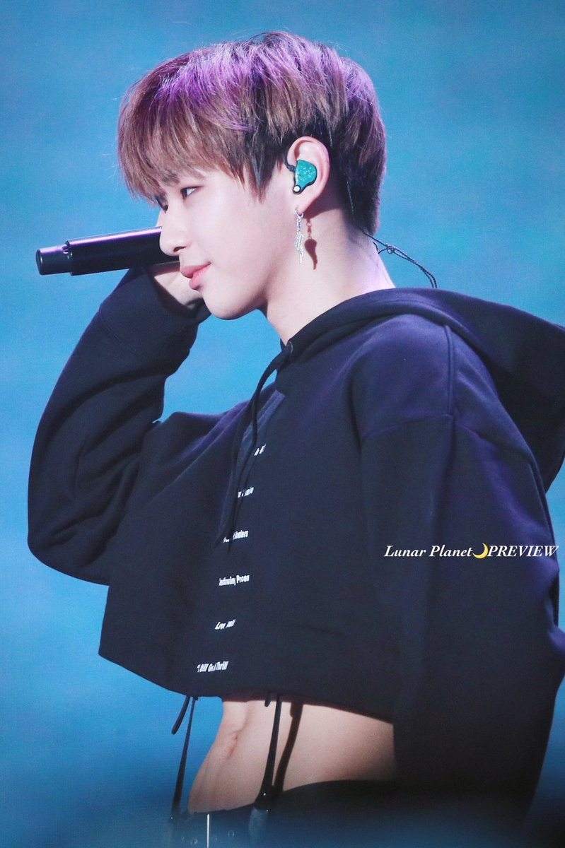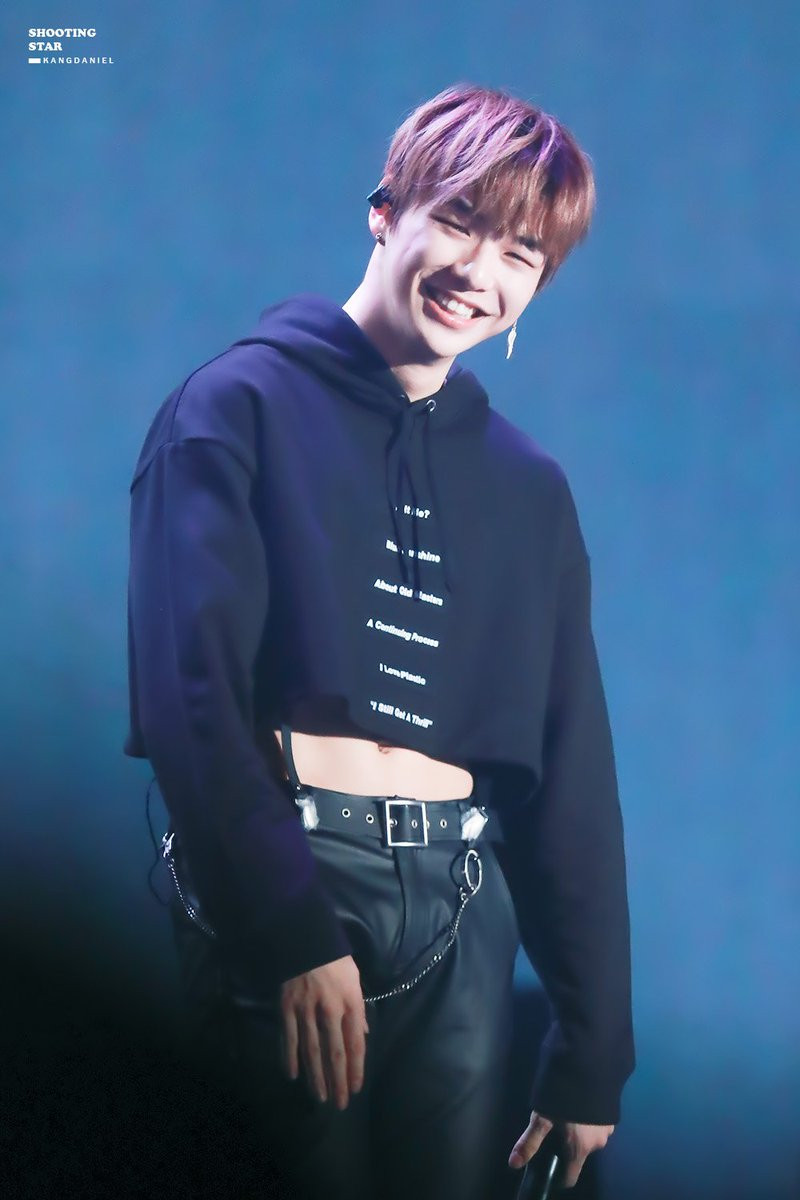 Kang Daniel mới vừa gia nhập hội các nam idol mặc crop top, nhưng cũng đủ làm khán giả ngất ngây rồi. Chiếc áo hoodie được cắt ngắn một phần thân dưới, giúp Kang Daniel vừa có phong cách khỏe khoắn quen thuộc, vừa khoe được vòng bụng đáng ngưỡng mộ của mình.