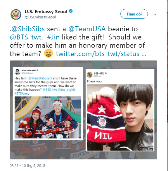 Đại sứ quán Hoa Kỳ tại Seoul cũng đã đăng thông tin về việc này và nói đùa rằng họ đã đề nghị Jin trở thành một thành viên danh dự của đội Olympic chính thức của Mỹ.