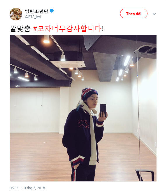 Sau Jin là V. Cũng trong ngày hôm đó, V đã đăng bức ảnh anh chàng đang đội nón với caption: "Phù hợp (ý là phù hợp với bộ quần áo của anh chàng] #thankyousomuchforthehat!".