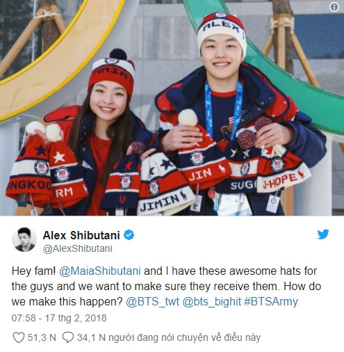 Nếu bạn còn nhớ thì Alex và Maia Shibutani, thường được gọi là ShibSibs, là hai vận động viên thuộc đội tuyển trượt băng của Mỹ tham gia thi đấu tại Thế vận hội mùa Đông PyeongChang 2018. Cả hai anh em đều là fan của BTS. Trong hành trang mang theo đến Hàn Quốc của ShibSibs có những món đồ rất đặc biệt, đó là 7 chiếc mũ len có thêu tên của 7 thành viên BTS.