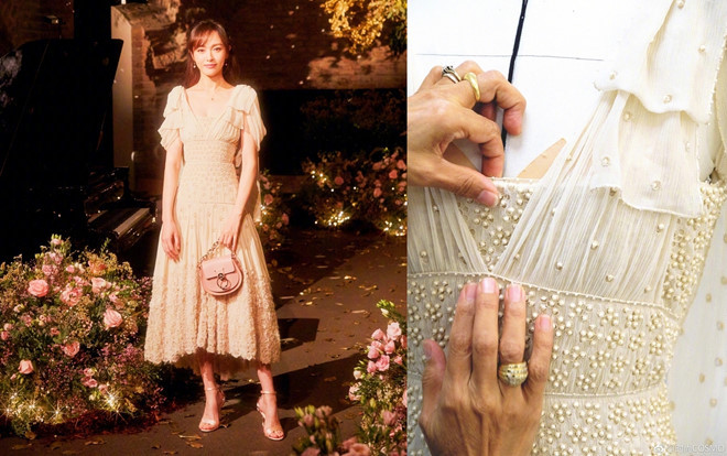 Ngoài ra, chiếc váy mà cô dâu Đường Yên diện trong buổi tiệc chào mừng quan khách trước khi lễ cưới chính thức diễn ra, cũng có lai lịch rất đặc biệt. Bộ váy này do đích thân giám đốc sáng tạo của thương hiệu Chloé thiết kế. Váy được may bằng chất liệu ren, đính rất nhiều hạt ngọc trai cũng như họa tiết thêu thủ công. Các nghệ nhân đã làm váy này trong 650 giờ (khoảng 27 ngày).