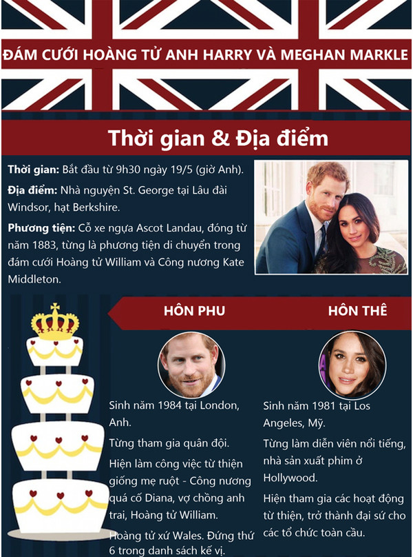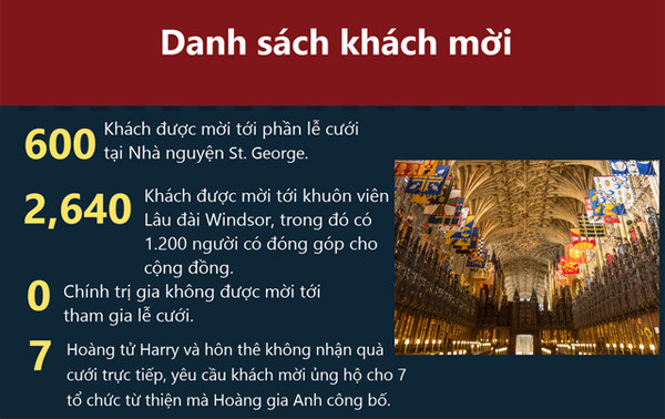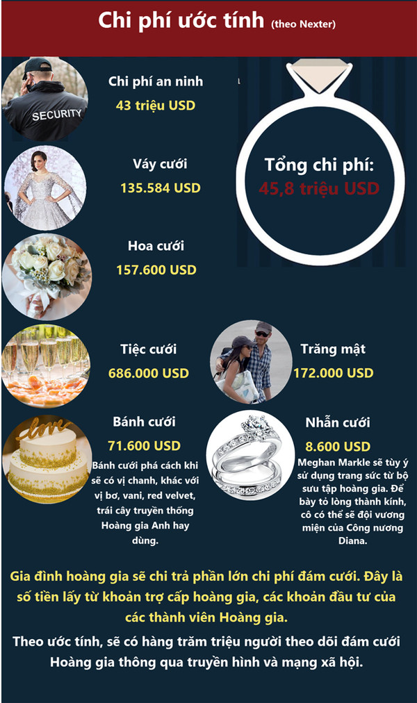 HHTO - Đám cưới của Hoàng tử Anh Harry và hôn thê Meghan Markle có khoảng hơn 2.000 khách mời, với chi phí gần 46 triệu USD, trong đó phần lớn là chi phí để đảm bảo an ninh.