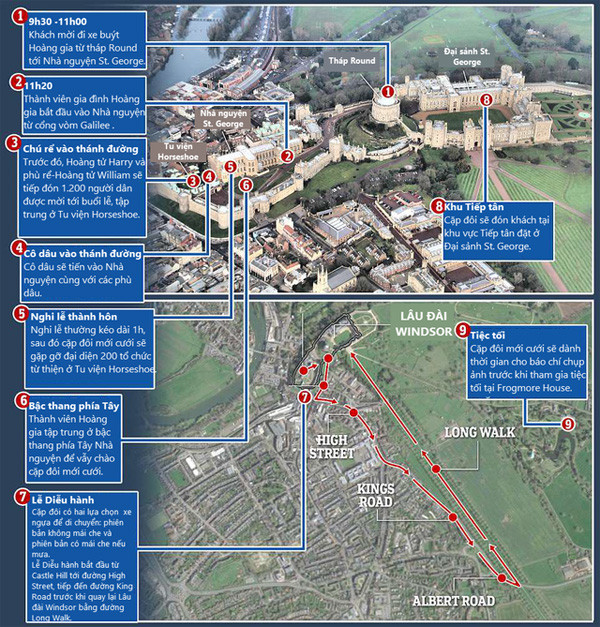 Lịch trình dự kiến đám cưới Hoàng gia (Đồ họa: Dailymail)