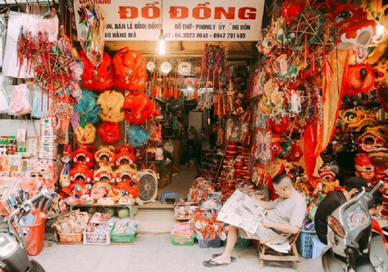 Trên các các con phố dọc đường Hàng Mã, Lương Văn Can, Hàng Lược, các hàng quán đều tưng bừng với muôn sắc màu của những gánh hàng đồ chơi như đèn ông sao, đèn kéo quân, tò he, mặt nạ…