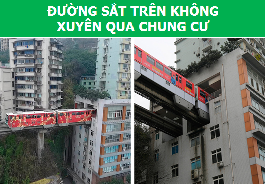 Trùng Khánh được mệnh danh là một thành phố có giao thông kỳ lạ bậc nhất Trung Quốc. Nếu là một cư dân ở đây, bạn sẽ phải làm quen với hình ảnh những đoàn tàu cứ chạy vun vút ở trên đầu và đường sắt trên cao đi xuyên qua tòa chung cư.
