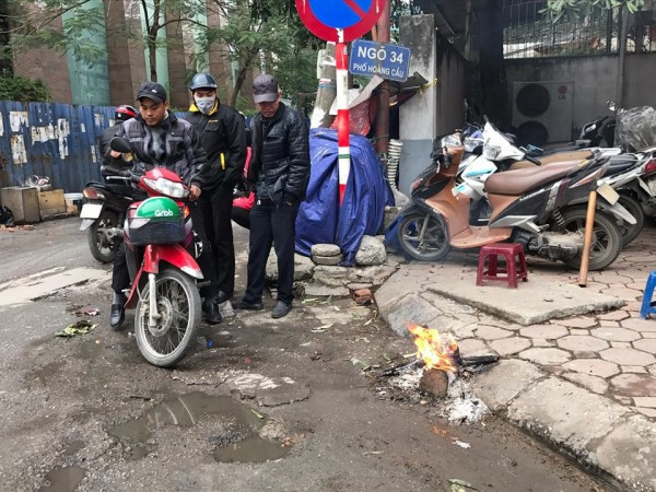 Trong lúc chờ khách, một lái xe ôm tranh thủ đốt củi. Theo anh, những ngày rét mướt thế này nhiều người ít đi xe hơn mà thay vào đó họ chọn taxi nhiều.