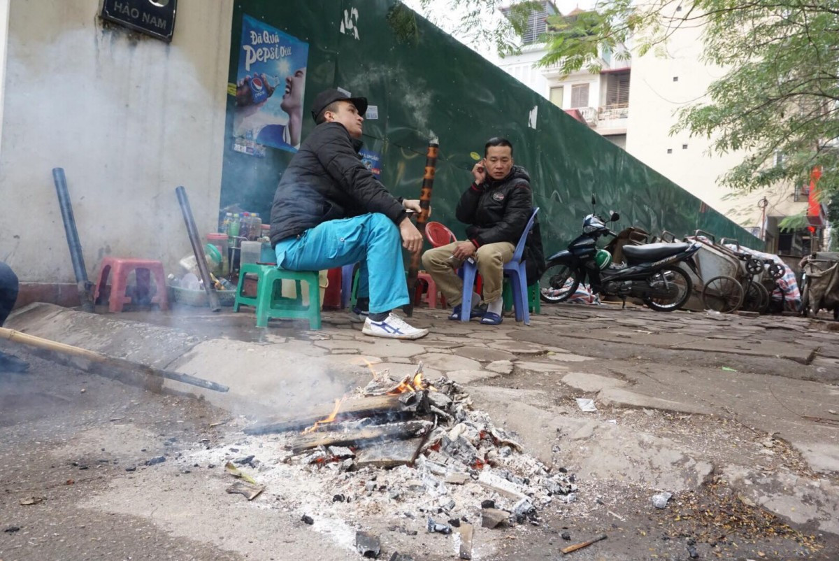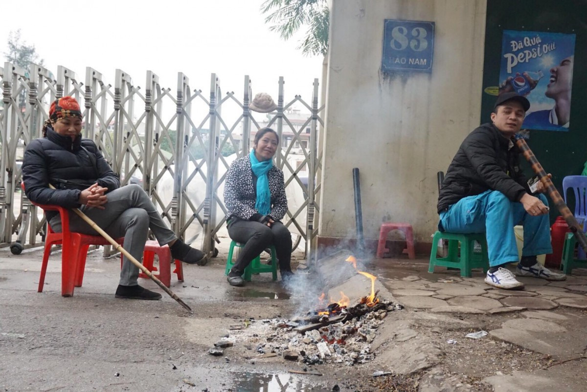 Một nhóm công nhân đứng chờ việc trên đường Yên Lãng, Hà Nội tranh thủ đốt đống lửa sưởi ấm. Cái lạnh như cắt da thịt khiến ai cũng co ro.
