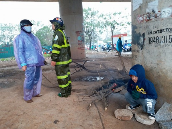 Trời lạnh giá nên một nhóm công nhân ở gần khu vực chân cầu Long Biên cũng tranh thủ đốt lửa sưởi ấm.