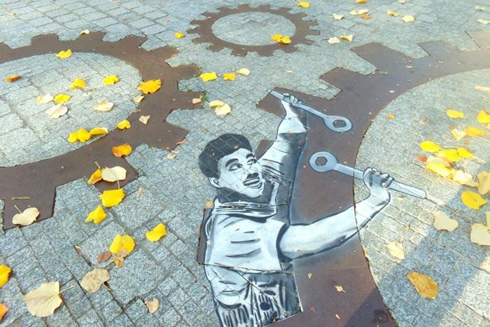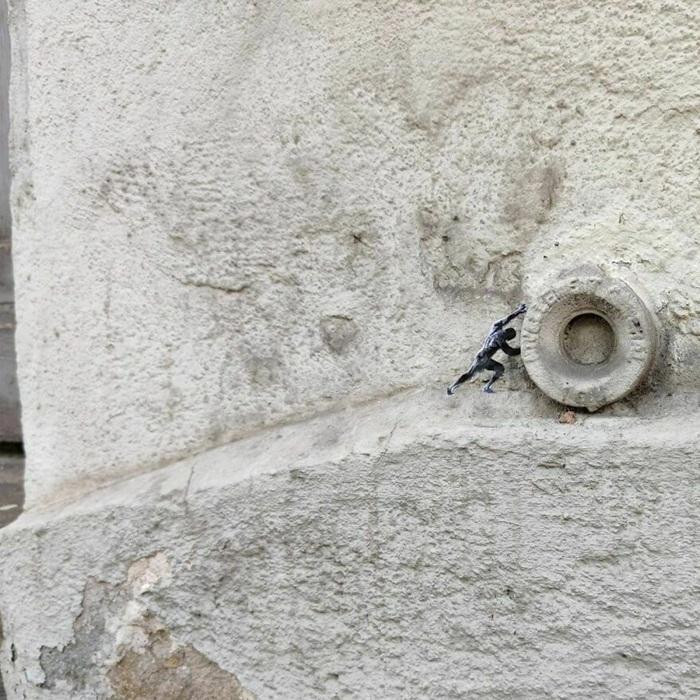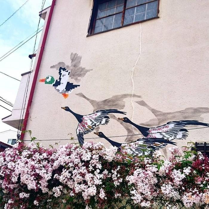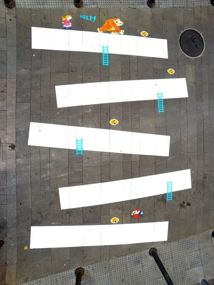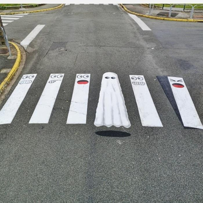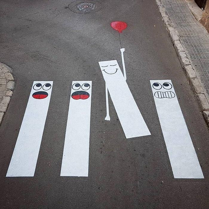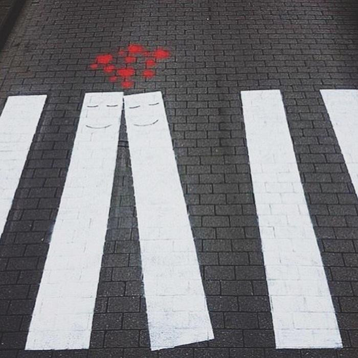Ngoài sở thích “khoác” áo mới cho những bức tường, Oak Oak còn thích “sáng tác” trên vạch kẻ đường, tạo nên những câu chuyện vui vẻ khiến người xem phải bật cười thích thú.