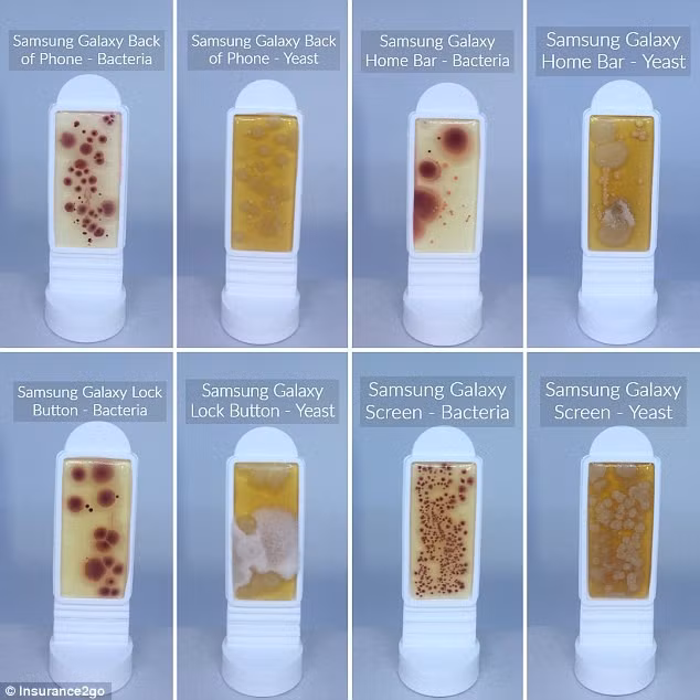 Trước đó, các nhà nghiên cứu từ Đại Học Standford đã công bố rằng một chiếc điện thoại di động bình thường có nguy cơ nhiễm vi khuẩn cao gấp 18 lần so với… chiếc bồn cầu tại các nhà vệ sinh công cộng. Do đó, không ngạc nhiên khi màn hình của cả 3 chiếc điện thoại đều có số lượng lớn vi khuẩn, nấm, mốc,…