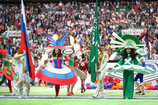 21h30, giờ Hà Nội, lễ khai mạc vòng chung kết bóng đá thế giới lần thứ 21 diễn ra trên sân Luzhniki, thủ đô Moskva (Nga). Khác với những kỳ khai mạc trước, buổi lễ diễn ra khá ngắn gọn và cô đọng, chỉ trong 20 phút. Ảnh: AFP.