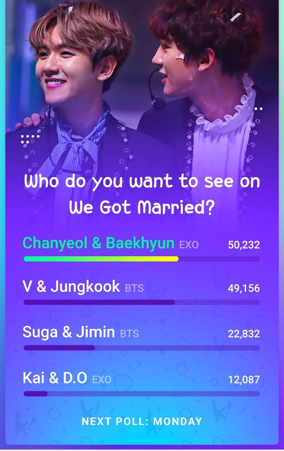 Trong một cuộc bình chọn xem fan K-Pop muốn thấy cặp đôi cạ cứng nào trên show We got married, Chanyeol và Baekhyun đã đứng đầu bảng.