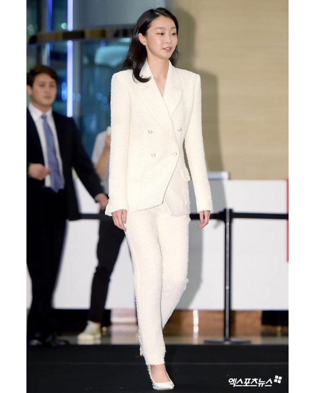 Diện suit trắng kết hợp với giày cùng màu trong một sự kiện, Kim Da Mi mang đến hình ảnh một cô diễn viên trẻ trung, năng động.