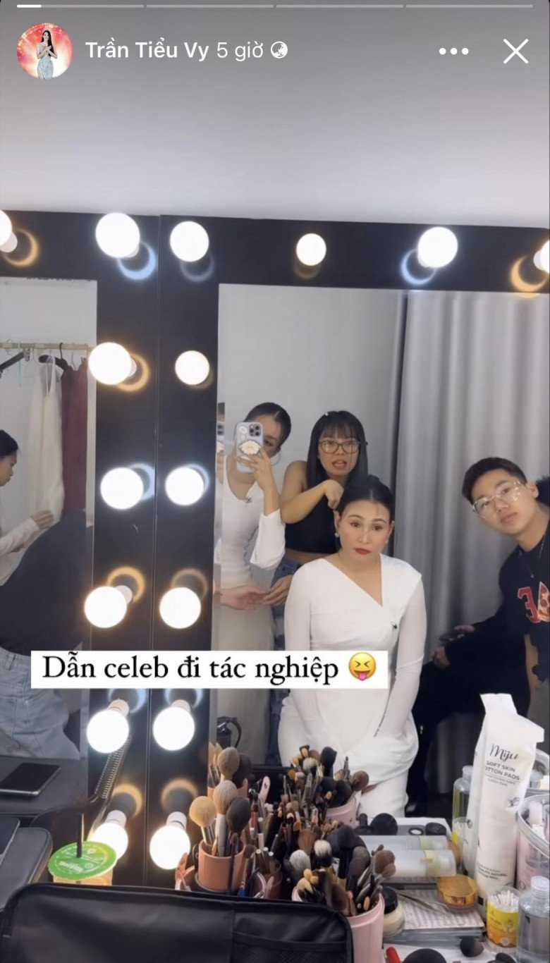 Trước đó, Tiểu Vy cũng đăng tải khoảnh khắc cùng mẹ chuẩn bị cho một buổi chụp hình. Nàng hậu đăng kèm dòng trạng thái lầy lội: "Dẫn celeb đi tác nghiệp". Trong hình có thể thấy, Tiểu Vy và mẹ mặc cùng một thiết kế váy trắng ôm dáng cổ lệch quý phái. Khi lên đồ, mẹ Tiểu Vy biến hóa với vẻ ngoài sang chảnh không khác gì người nổi tiếng.