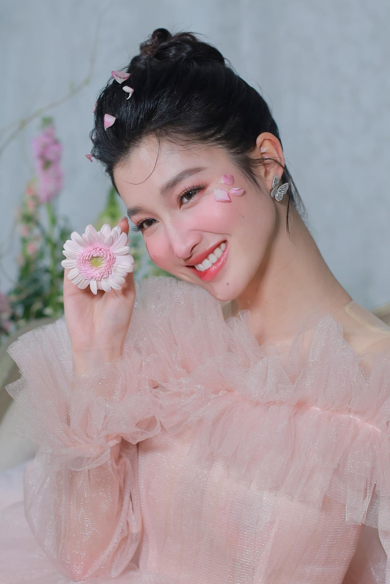 Cô diện bộ váy voan xếp tầng như đám mây bồng bềnh, chọn tông màu hồng ngọt ngào cho layout trang điểm và không quên gài một vài cánh hoa hồng lên mái tóc. Thế là đủ để Phương Nhi như một nàng tiên hoa lạc từ xứ sở cổ tích đến đây.