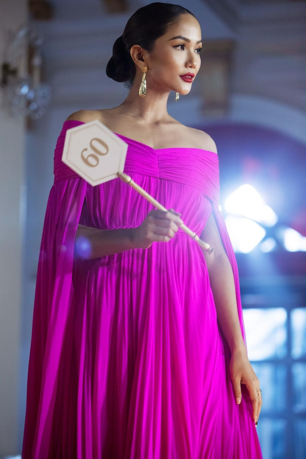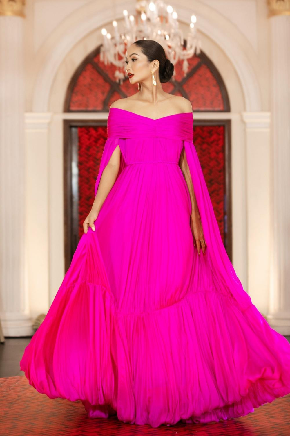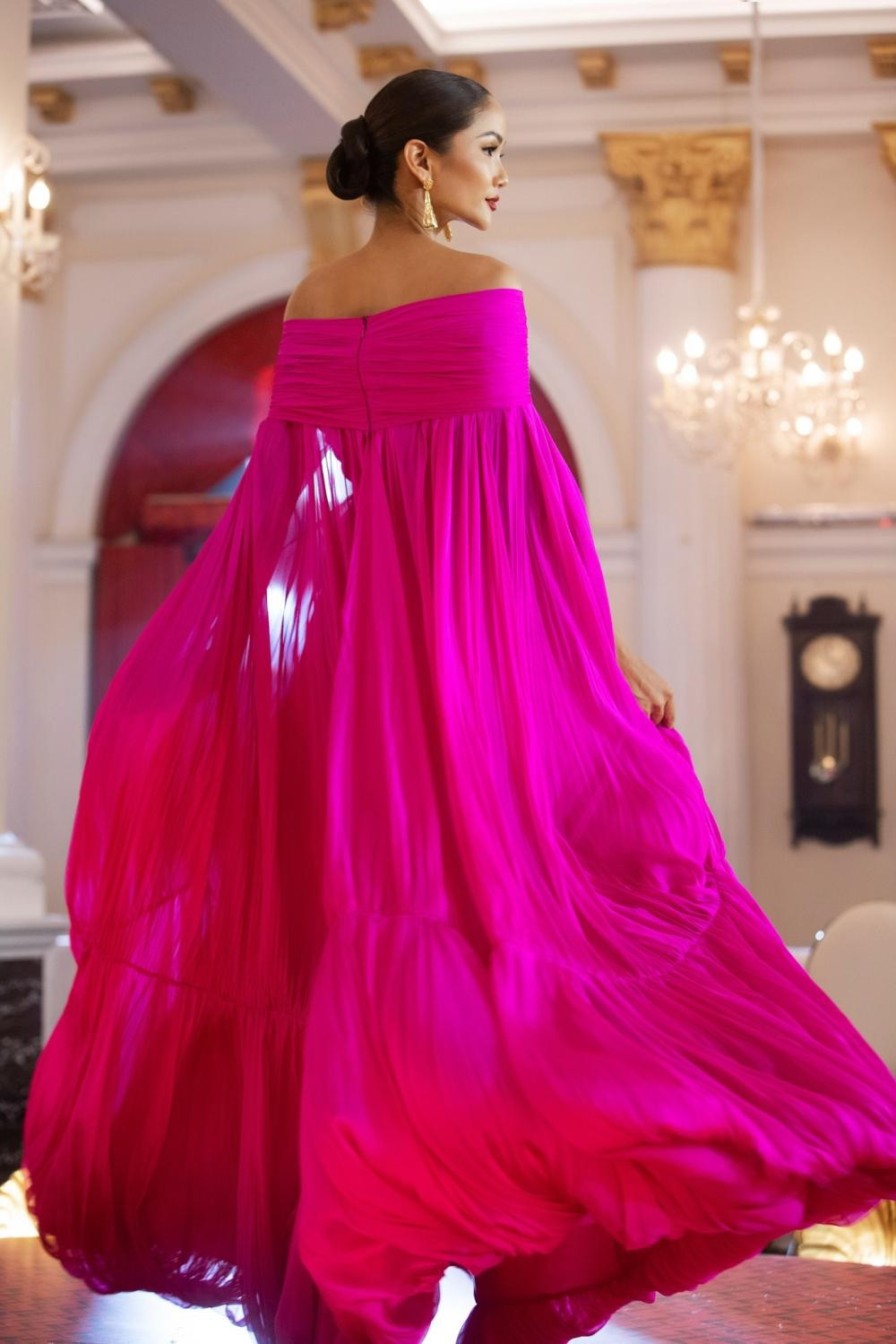 Nàng hậu nổi bật trong thiết kế màu hồng sen đậm, được NTK Công Trí thiết kế riêng theo đúng số đo của Hoa hậu H’Hen Niê.