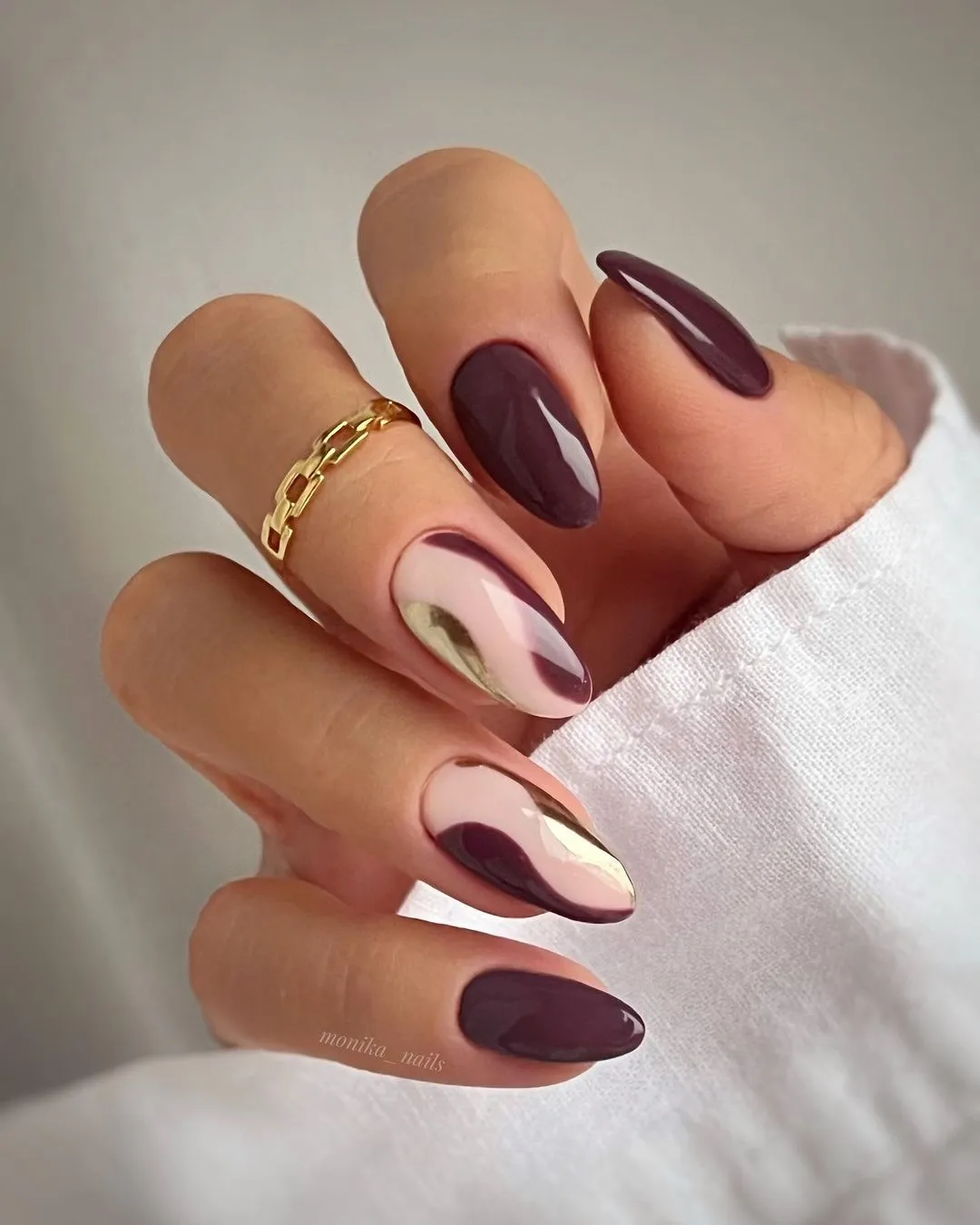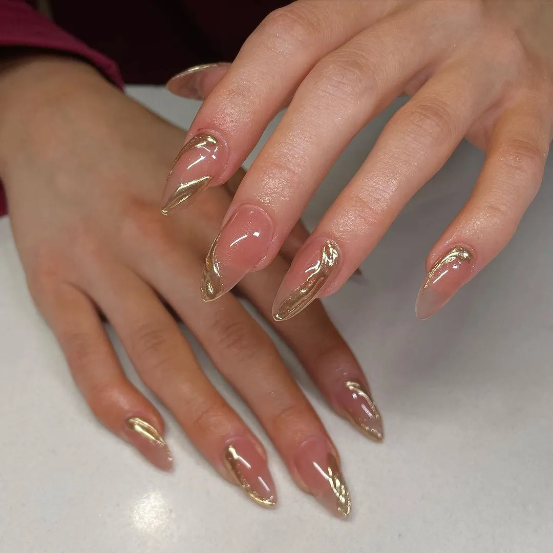 Nâng cấp kiểu móng tay thiết kế cấu trúc lên một tầm cao mới với lớp mạ crôm nhũ vàng sáng bóng. Tuy nhiên, phần nền móng được sơn màu nude để có cảm giác tối giản hơn.