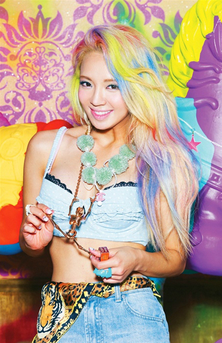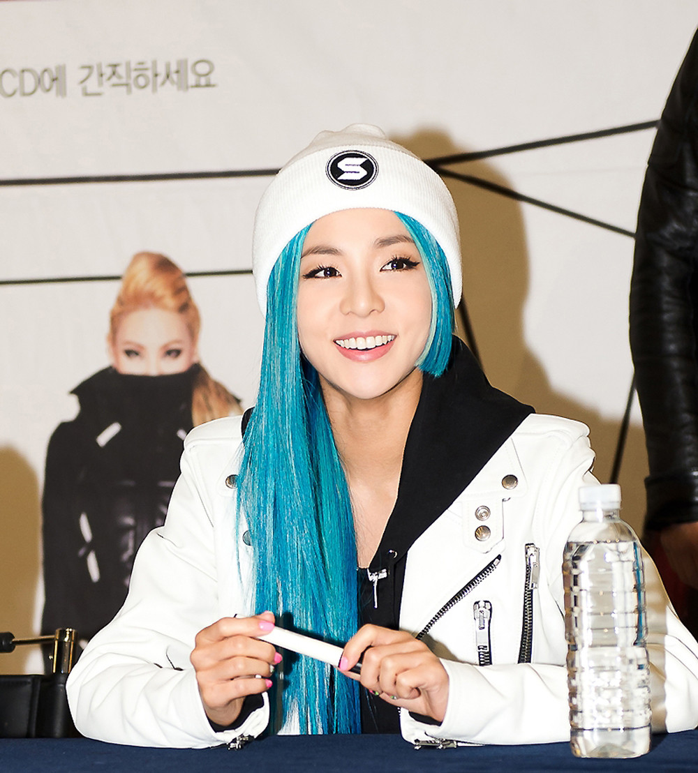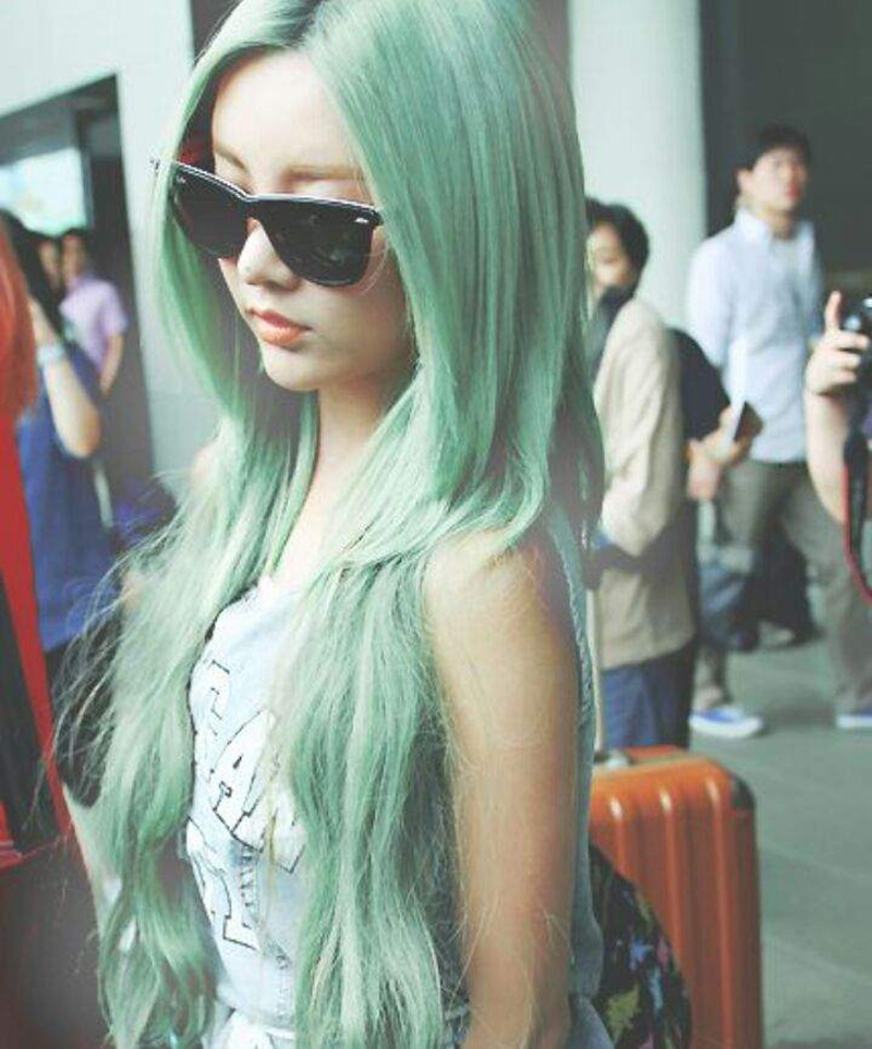 Dara (2NE1) có gương mặt cá tính nên cũng không khó để chinh phục mốt tóc xanh. Bình thường đây là màu rất kén vì nó chỉ thích hợp với làn da hồng hào, tối kỵ người da tái xanh, vàng nhợt.