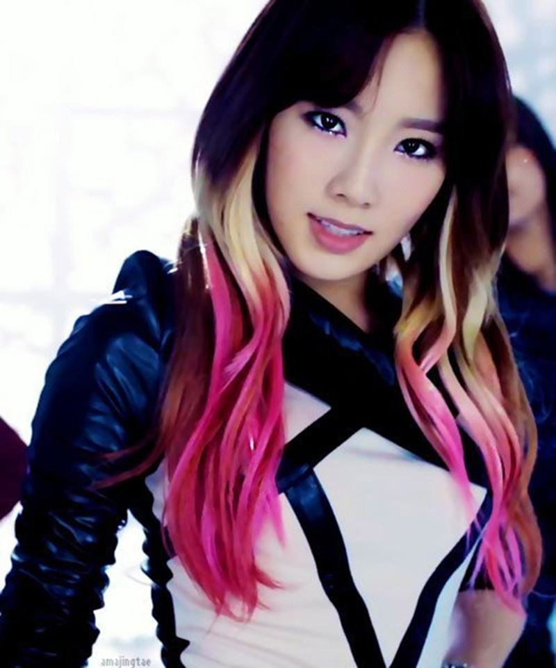 Được mệnh danh là "thánh ombre", Taeyeon nghĩ ra muôn vàn kiểu nhuộm sáng tạo, một trong số đó là chia mái tóc thành 3 phần với 3 tông trái ngược hoàn toàn.