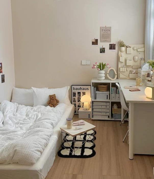 Ngoài ra, sử dụng màn gió, màu gạch sàn, đồ decor màu trắng cũng khiến căn phòng thoáng đãng và sáng sủa hơn.