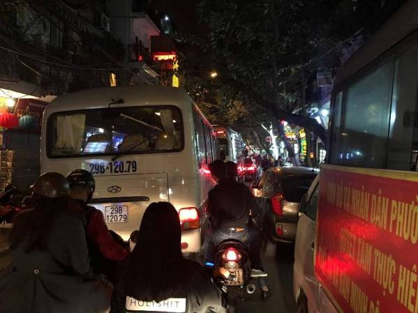 Tình trạng tắc đường vẫn tiếp diễn sau 20h tối. Ảnh chụp tại phố Hàng Bạc.