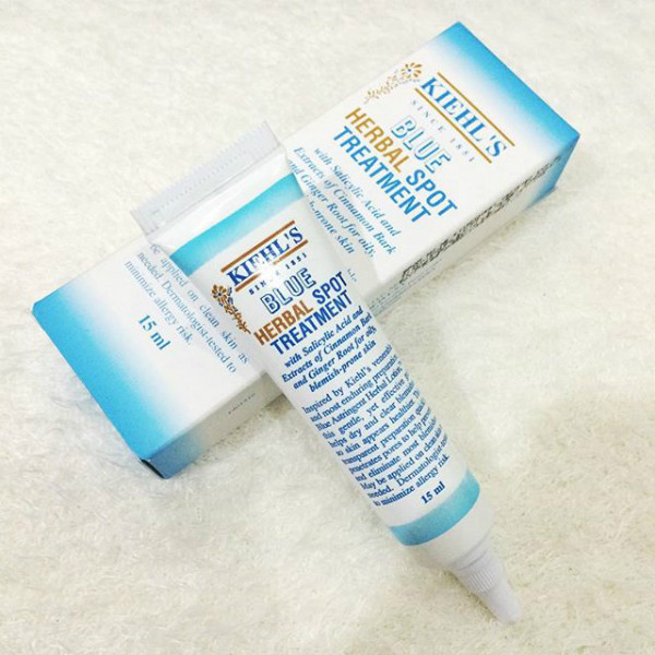 Kem trị mụn Kiehl's Blue Herbal Spot Treatment có kết cấu dạng gel trong suốt, mỏng nhẹ. Đối với các nốt mụn trứng cá, mụn viêm sưng mới thì trong 2-3 ngày, mụn sẽ bớt sưng, xẹp, đầu mụn khô, nhân gom lại. Mỗi tuýp kem 15g có giá bán khoảng hơn 400k. Tuy hiệu quả nhưng vì có chứa cồn nên có thể gây kích ứng với da nhạy cảm.