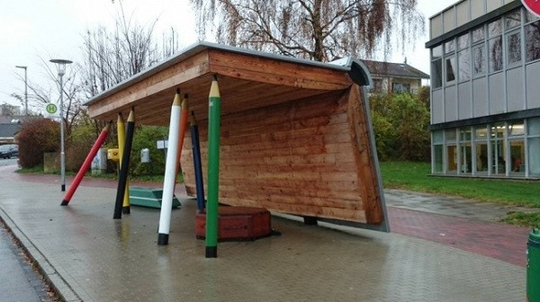 Trạm xe buýt của trường học này được thiết kế giống như một quyển sách chống đỡ bằng những cây bút chì. Ý tưởng thiết kế thật phù hợp để đặt trong khuôn viên trường.