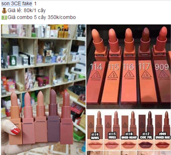 Bên cạnh những shop công khai là hàng fake, nhiều nơi bán son nhái với giá ngang ngửa son xịn, sử dụng hình ảnh son chính hãng để quảng bá, mập mờ thông tin đánh lừa khách hàng. Không ít người chi số tiền không nhỏ để sắm về những thỏi son rập khuôn 3CE nhưng chất lượng thì kém hơn hẳn.