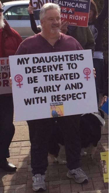 Người cha với tấm biển mang dòng chữ: "Con gái tôi xứng đáng được đối xử công bằng và tôn trọng".