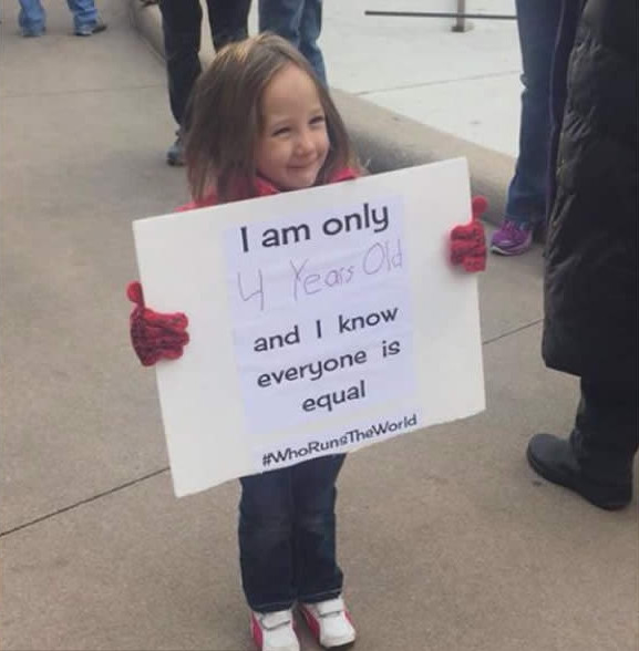 Một cô bé với biểu ngữ: "Cháu mới chỉ 4 tuổi nhưng cháu biết mọi người đều bình đẳng."